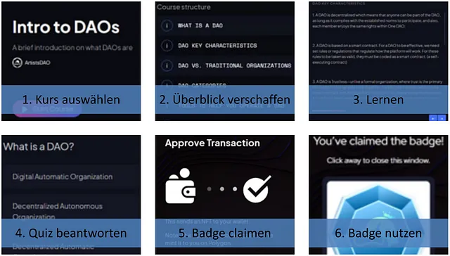 Die Präsentation der Kursinhalte erfolgt in Form mehrerer Folien, die man nacheinander durchklicken kann. Es erfolgt eine Wissensabfrage in Form eines Quiz mit Multiple-Choice-Fragen. Nach erfolgreichem Abschluss erhält man ein NFT-Badge, welches die erfolgreiche Teilnahme am entsprechenden Kurs bestätigt und kostenlos “geclaimt“ werden kann. Die anfallenden Transaktionsgebühren werden dabei von 101 übernommen, sodass für den Nutzer keine Kosten anfallen.